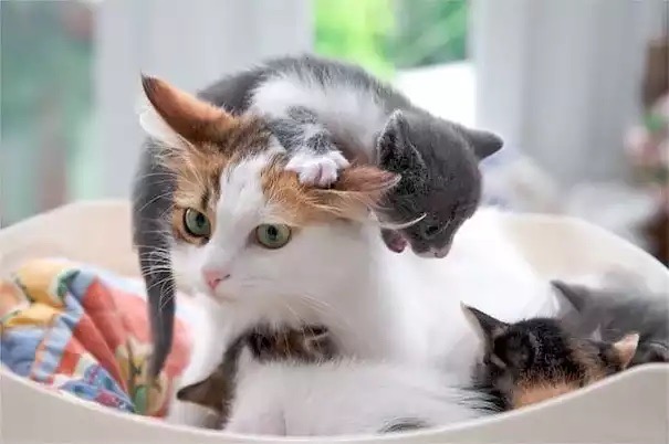 12) Questa mamma si è impegnata molto per dare alla luce tre gattini dai colori tutti differenti.
