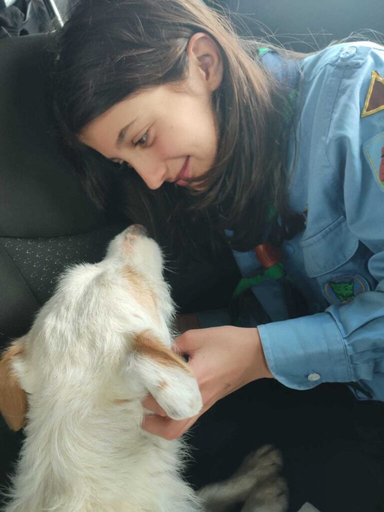 Eleni, ritratta con la sua divisa da Scout, attende i suoi genitori che la devono andare a prendere. Ciò che troverà in auto sarà una bellissima sorpresa. I genitori, infatti, la accolgono dopo che la ragazza è stata con i suoi amici, mostrando all’interno dell’abitacolo la dolce Tea, una cagnolina che ora diventerà parte della famiglia per sempre. Eleni desiderava da tanto tempo la possibilità di prendersi cura di un cane. Ora che il sogno è diventato realtà non riesce quasi a crederci.