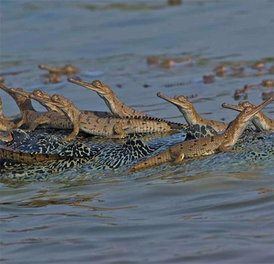 Altre specie di questi animali proteggono i propri figli, all’interno della loro bocca, tuttavia il gharial ha il muso troppo piccolo per ospitarli e quindi questi sfruttano la loro schiena, come base d’appoggio.