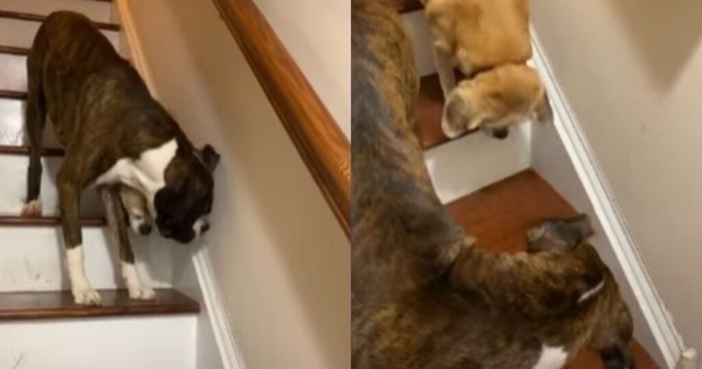 Il Boxer aiuta l’amico cieco a salire e scendere le scale
