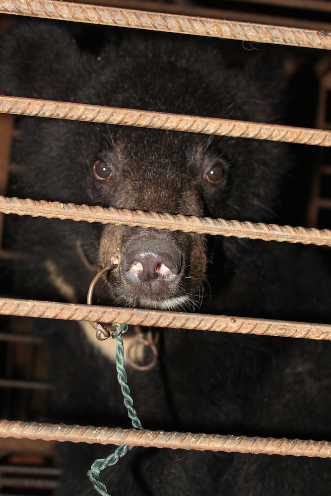 Il muso dell’orso nella gabbia, è stato trafitto da un anello di metallo, pratica molto utilizzata per il controllo dell’orso tramite il dolore. Questi sono metodi frequentemente utilizzati senza alcun trattamento medico.
